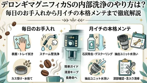 この記事はPRを含みます。 「デロンギのマグニフィカSを買ったけど、内部洗浄ってどうやるの?」 「そもそもどのくらいの頻度でやればいいの?」 ——そんな疑問を持っている方、多いのではないでしょうか。 全自動コーヒーマシン...