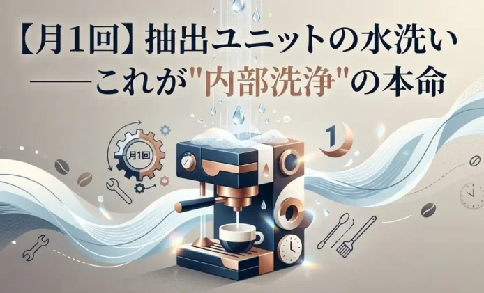 抽出ユニットは、挽いた豆を圧縮してお湯を通す、まさにマシンの心臓部。ここにコーヒーの油分やカスが少しずつ蓄積していくため、定期的な洗浄が必要です。