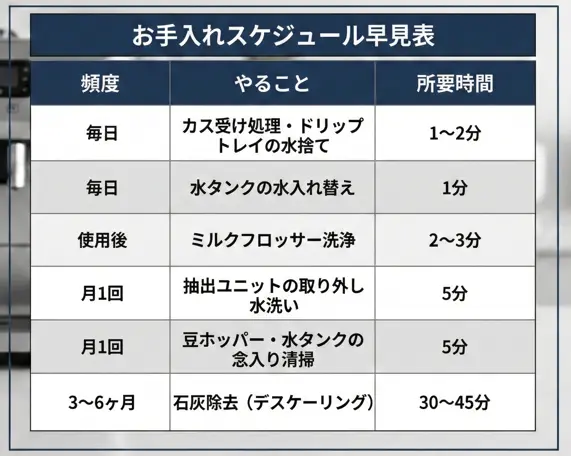 これから購入を検討している方も、すでにお持ちの方も、この記事のスケジュール表を参考に、マグニフィカSと末長くおいしいコーヒーライフを楽しんでください。