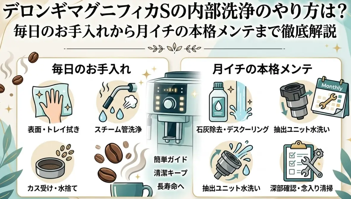 この記事では、デロンギ マグニフィカS(ECAM22112シリーズ)の内部洗浄について、毎日やること・週イチでやること・月イチでやることの3段階に分けて、わかりやすく解説していきます。