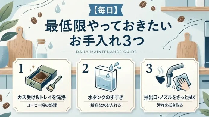 こうして見ると、日常的に必要なのは1日5分程度のケアだけ。それだけで本格的なコーヒーが毎日楽しめると考えたら、かなりコスパの良い投資ではないでしょうか。