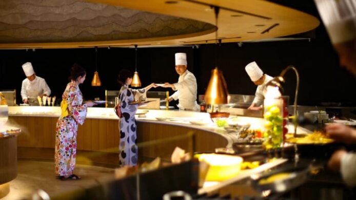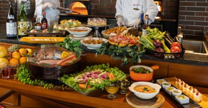 海の幸をふんだんに使った料理やライブキッチンで仕上げるできたてメニューが並びます。